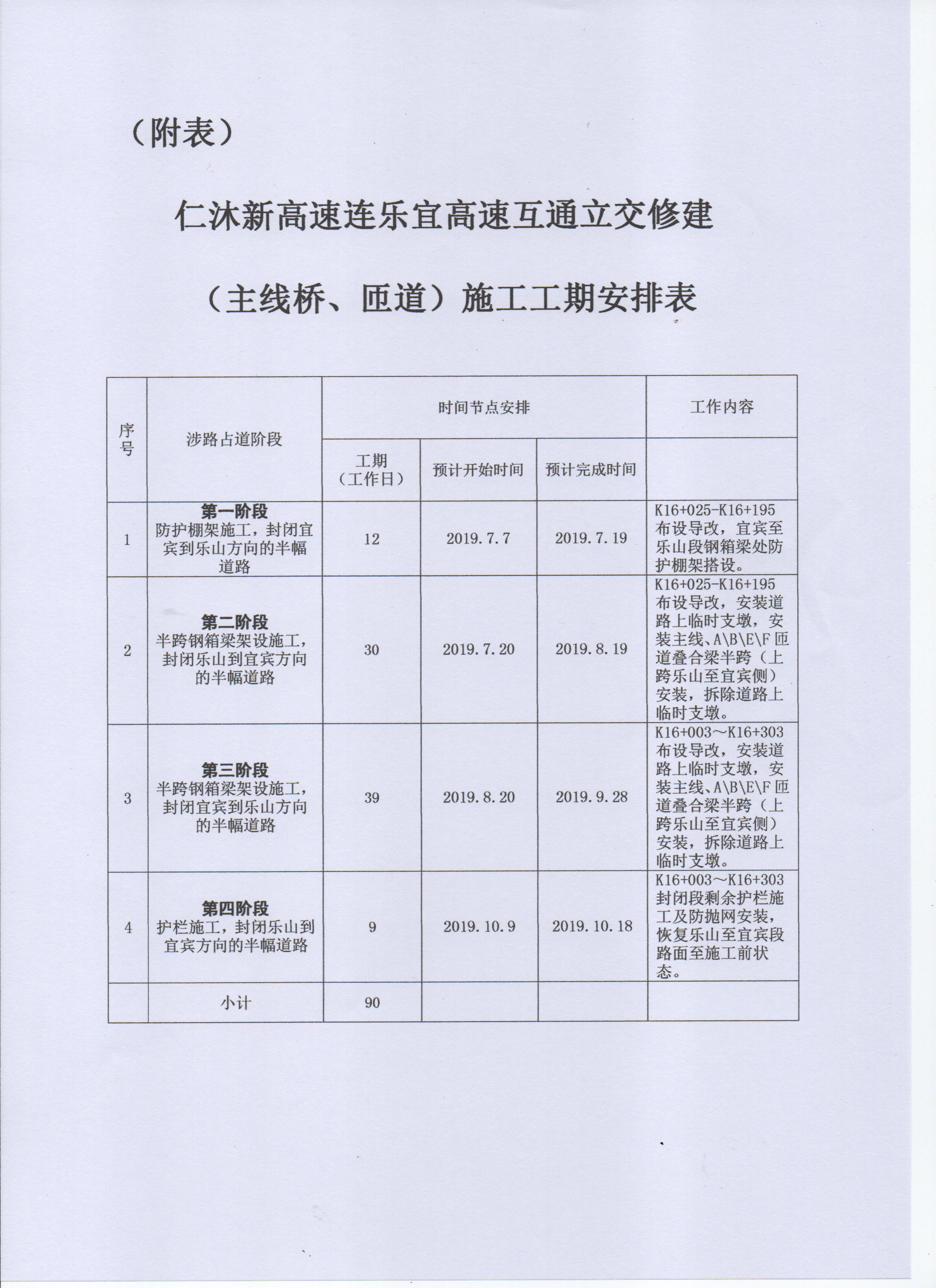 第一阶段:施工预计7.7-7.19,工期12天,封闭宜宾—乐山方向,反方向实行单幅双向。