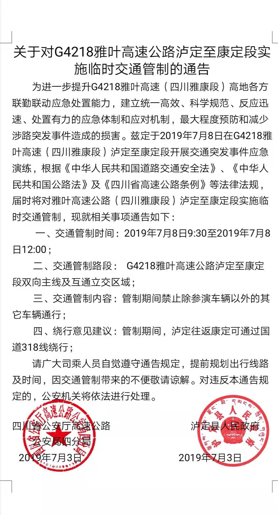 记者从高速公路公安局四分局获悉,为进一步提升G4218雅叶高速(四川雅康段)高地各方联勤联动应急处置能力,建立统一高效、科学规范、反应迅速、处置有力的应急体制和应对机制,最大程度预防和减少涉路突发事件造成的损害。兹定于2019年7月8日在G4218雅叶高速(四川雅康段)泸定至康定段开展交通突发事件应急演练,根据《中华人民共和国道路交通安全法》、《中华人民共和国公路法》及《四川省高速公路条例》等法律法规,届时将对雅叶高速公路(四川雅康段)泸定至康定段实施临时交通管制。