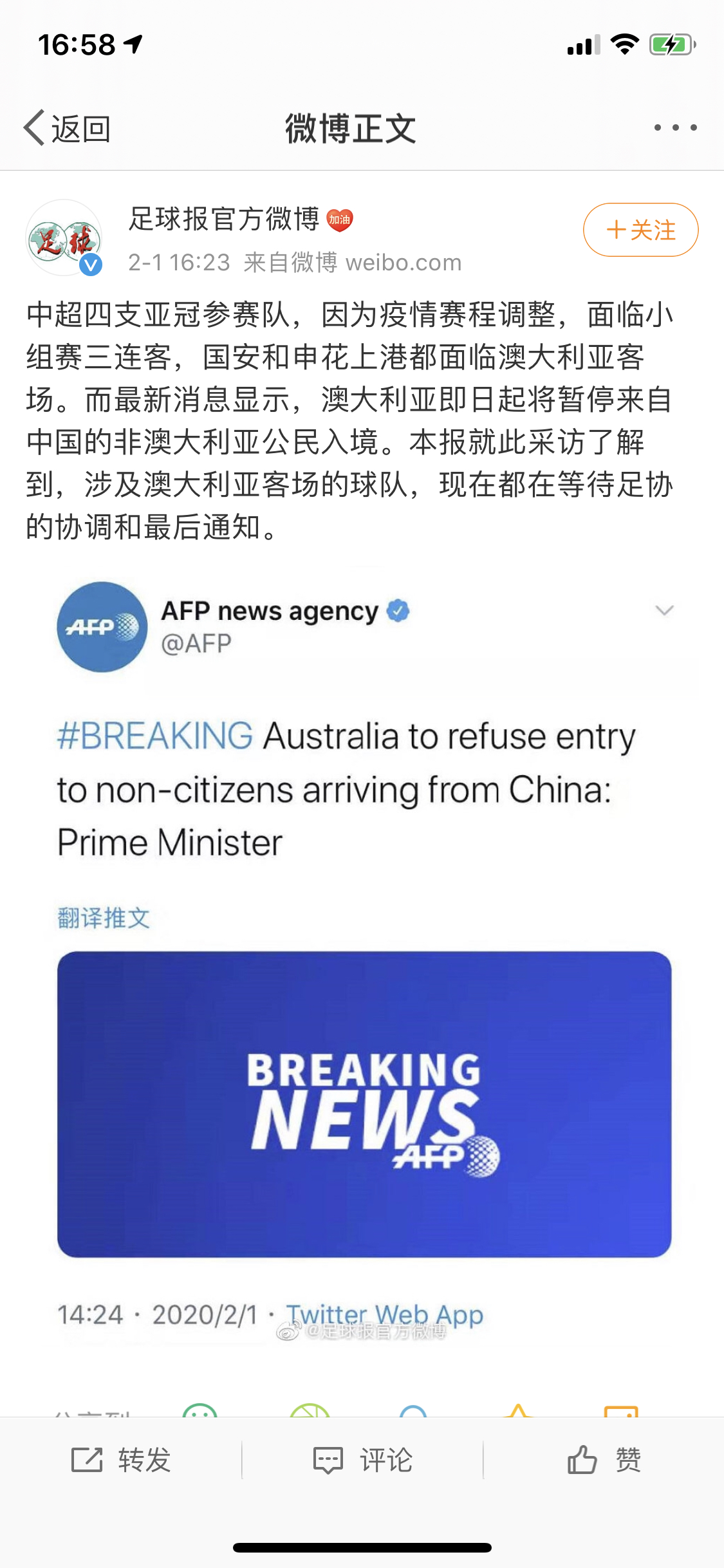 这一政策恐怕将影响到中超三队亚冠征程。据《足球报》官方微博消息,涉及澳大利亚客场的球队,现在都在等待足协的协调和最后通知。
