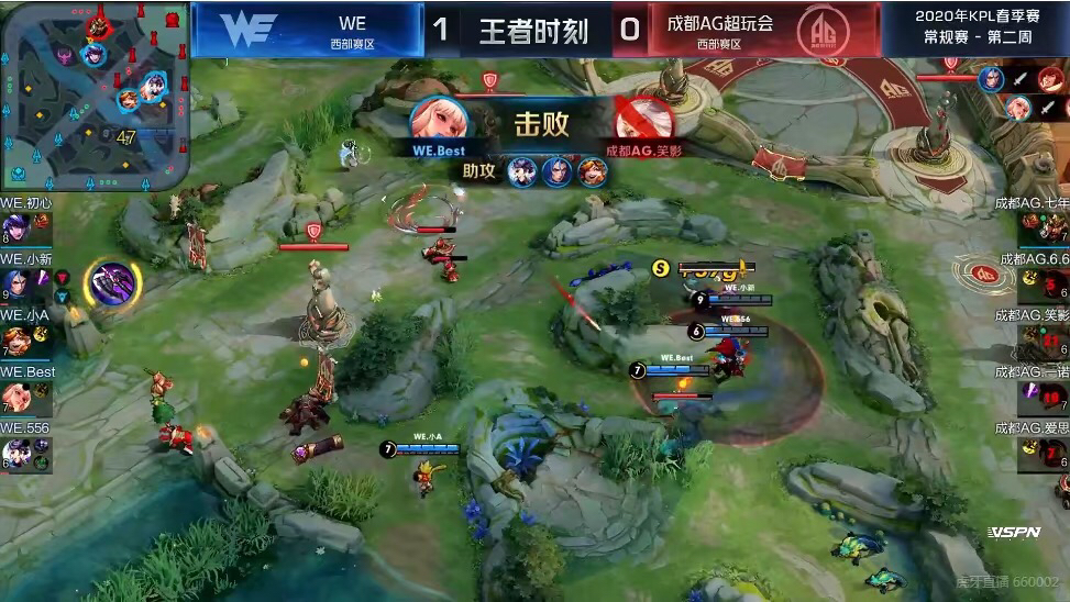 虽然WE是KPL这么多战队中战绩最差的战队,但是AG超玩会并没有看不起对手,第一局就拿出了他们此前在KPL保持全胜的阵容。裴擒虎,苏烈加吕布,这是AG超玩会最强的阵容之一。