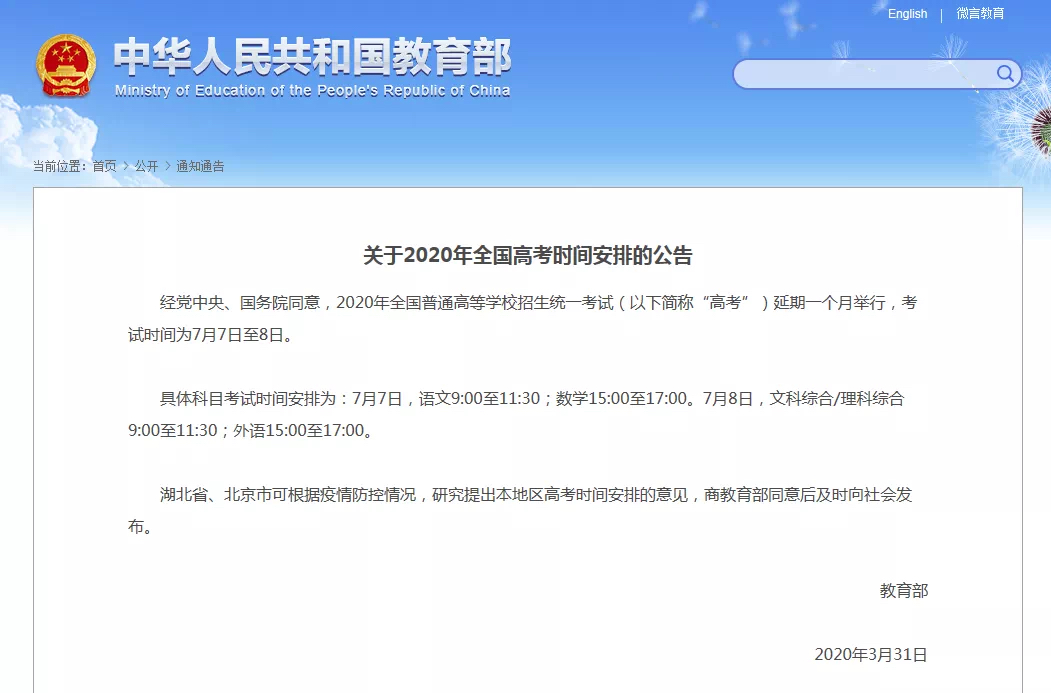 今年高考延期一个月,总体上高考后填报志愿和录取时间将较往年整体推迟1个月左右。