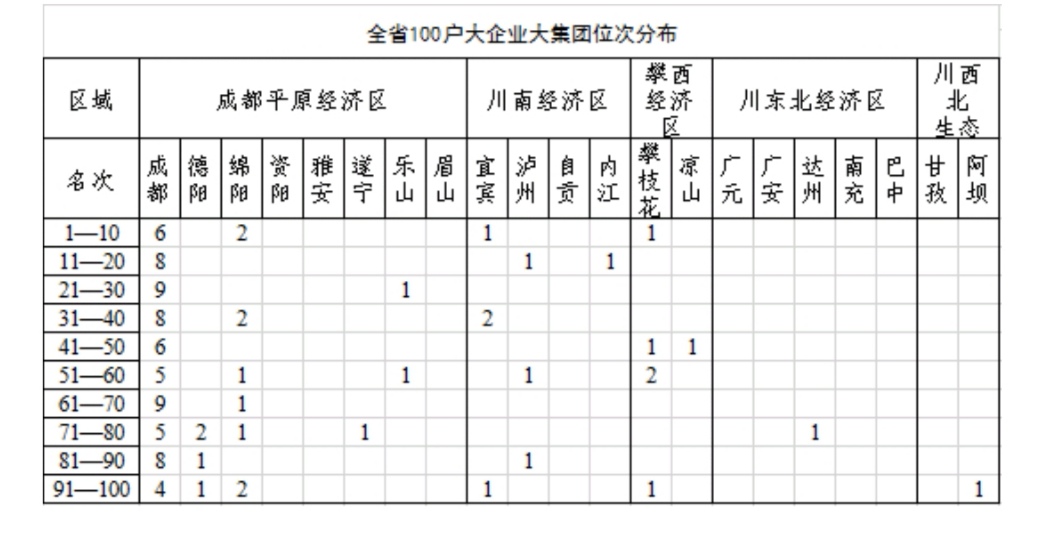 100户榜单企业成都市占68席,环成都经济圈占84席,川南经济区占8席,川东北经济区占1席,攀西经济区6席,川西北经济区1席。与2019年榜单相比,成都市减少10席,环成都经济圈减少6席,川南经济区增加3席,川东北经济区增加1席,攀西经济区增加1席,川西北经济区增加1席。眉山、自贡、雅安、广安、资阳、广元申报的企业因体量差距而无缘榜单,南充、巴中、甘孜因企业申报缺失而无缘榜单。