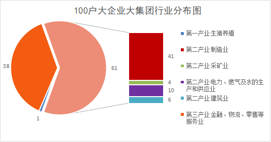 100户榜单中,第一产业1席,主营生猪养殖;第二产业61席,其中制造业41席;第三产业38席,涉及金融、物流、零售等服务业。较2019年度榜单,制造业减少9席,建筑业减少10席,生猪养殖业增加1席,采矿及能源发电业增加3席,服务业增加15席。100户榜单中有80户企业涉足“5+1”现代产业体系,总营收超过27000亿元,占100户榜单企业营业收入的84%。