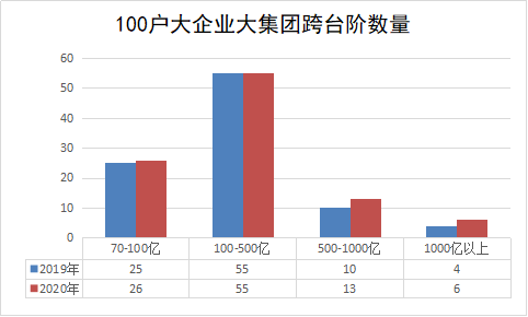 100户榜单企业中,营业收入过100亿元企业共计74户,较2019年增加5户。其中,1000亿级企业6户,较2019年榜单增加2户;500-1000亿企业13户,较2019年榜单增加3户;100-500亿企业55户,与2019年榜单持平。