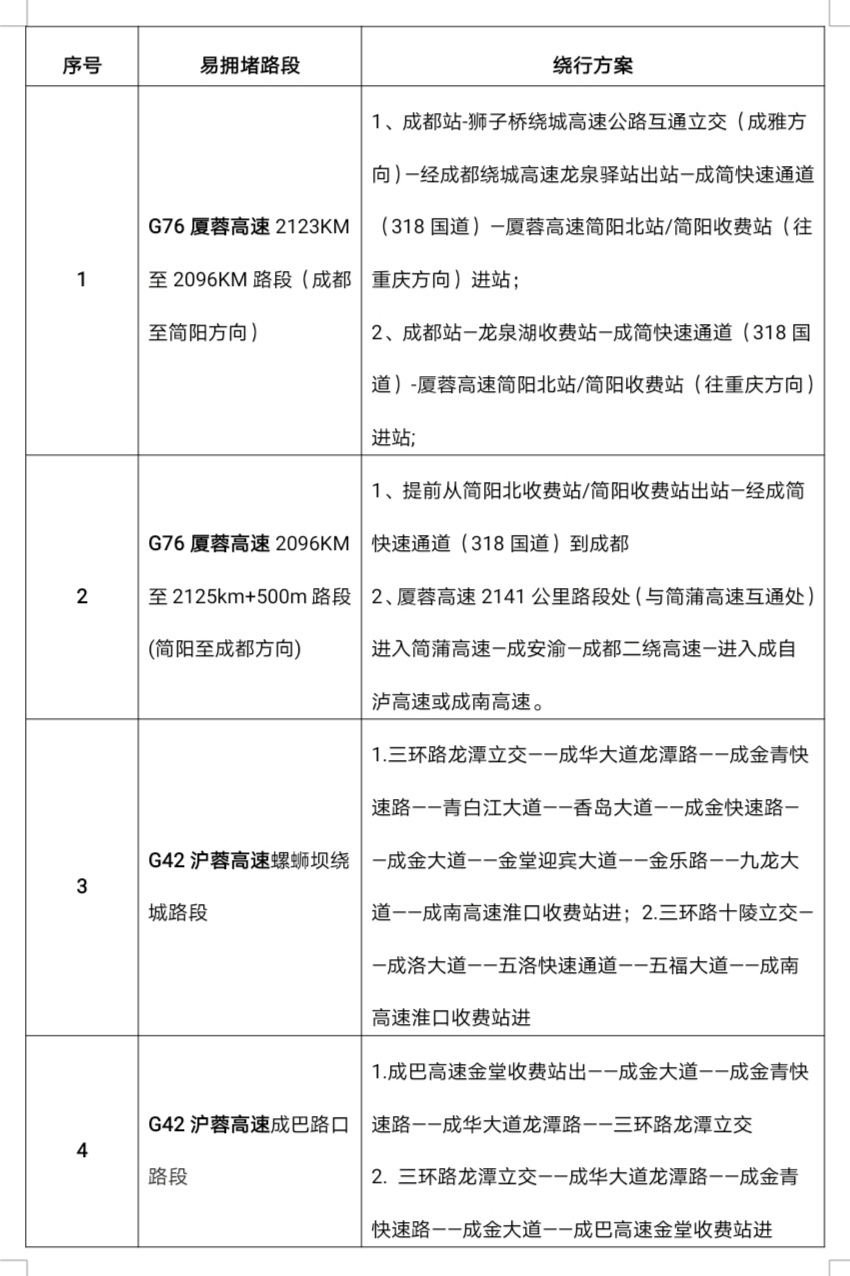 元旦假期,成都绕城、成南、成温邛、成巴、成雅、成渝、渝蓉、成自泸、雅康、雅西、内宜等主干高速公路通行压力较大;进出城高速公路和通往景区路线上的隧道、互通立交、收费站、服务区是易拥堵段点。
