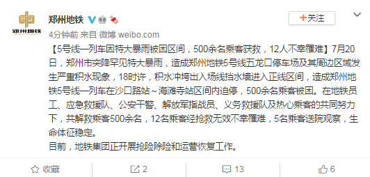 此次强降雨造成郑州地铁5号线五龙口停车场及其周边区域发生严重积水现象,7月20日18时许,积水冲垮出入场线挡水墙进入正线区间,造成郑州地铁5号线列车在海滩寺街站和沙口路站隧道列车停运。18时10分,郑州地铁下达全线网停运指令,组织力量,疏散群众,共疏散群众500余人,其中12人经抢救无效死亡、5人受伤(均已送医)。
