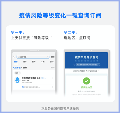 此外,如果你想知道自己所在地区或者出行目的地地区的疫情风险等级,国务院客户端已在支付宝上线了查询服务,您可搜“疫情等级”查看;此外,如有意愿需接种新冠疫苗,可上支付宝搜“新冠疫苗”进行预约接种,浙江、四川等地区还支持帮家人预约。