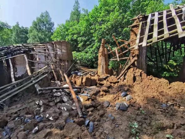 “16号那天突降暴雨,我们的房子前面出现了一条裂缝,村上的干部立即赶来进行了查看,让我们赶紧搬离出来,我们当天就住到了亲戚家。”走过一段坑洼狭窄的碎石路段后,记者见到了家住广元市苍溪县元坝镇青店村的韩勇林,他的家目前已坍塌了大半,旁边的村道上是一条大大的裂缝。据他介绍,裂缝出现后,镇驻村干部及村、组干部立即赶到现场,帮助他转移安置到了亲友家中,并对现场设立了安全警示带。撤离当晚,他家房子的房梁、瓦片、砖木便陆续掉落,17日一早,房屋发生倒塌。“房子垮了后,我们就一直住在亲友家,今天特意回来看看该咋个恢复重建。”韩勇林说道。