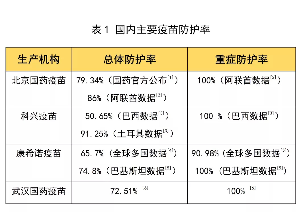 我国疫苗在总体有效率和预防重症方面表现良好,虽然对变异病毒的防感染效力有所减弱,但在防重症、防死亡方面仍具有良好的效力,新冠疫苗对重症的防护率接近100%(详细防护率数据见表1)。