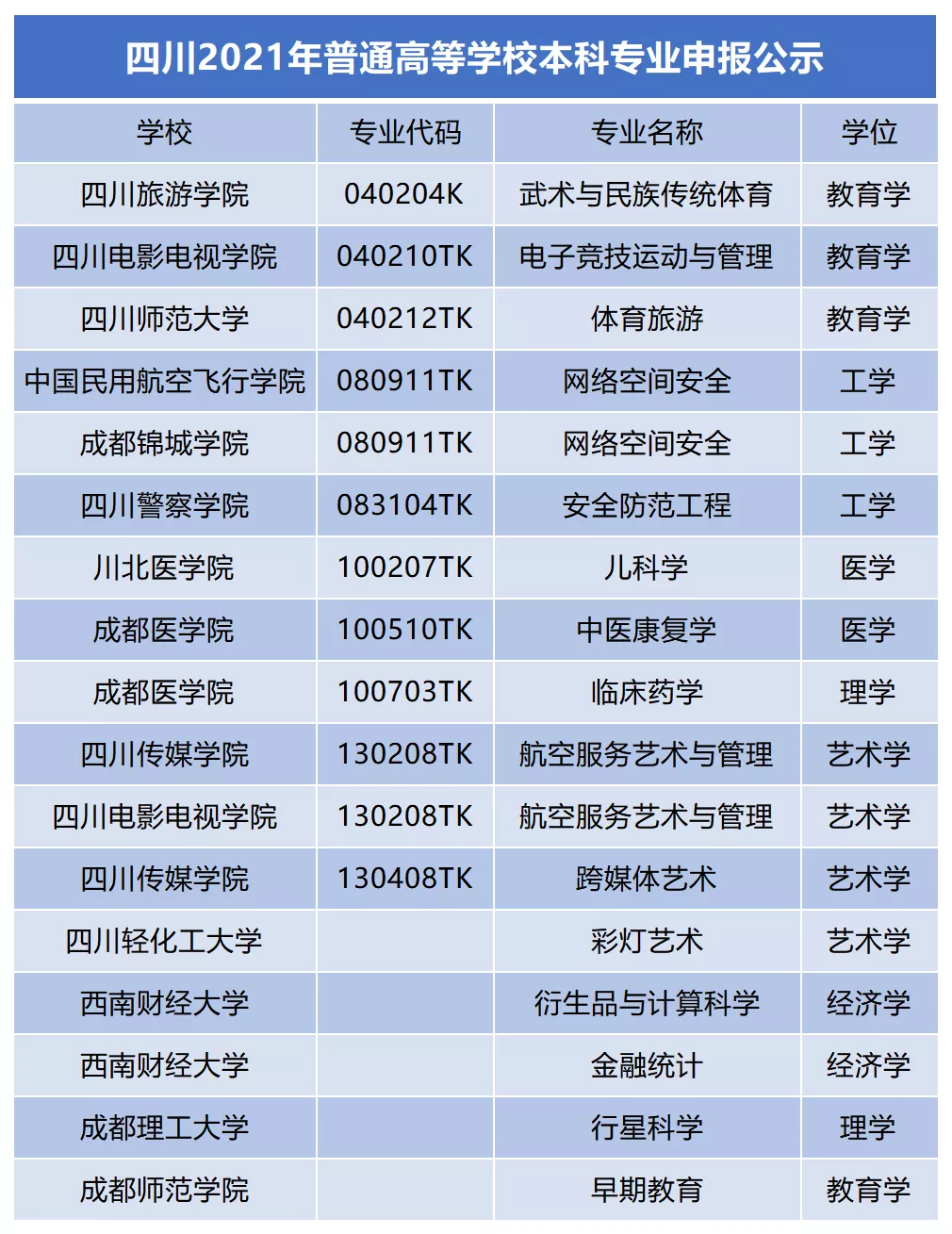 根据《教育部高等教育司关于开展2021年度普通高等学校本科专业设置工作的通知》,本年度专业申报工作已经结束。各高校共申报国家控制布点专业306个、尚未列入本科专业目录的新专业139个。其中川内13所高校拟新增专业17个,具体如下表:
