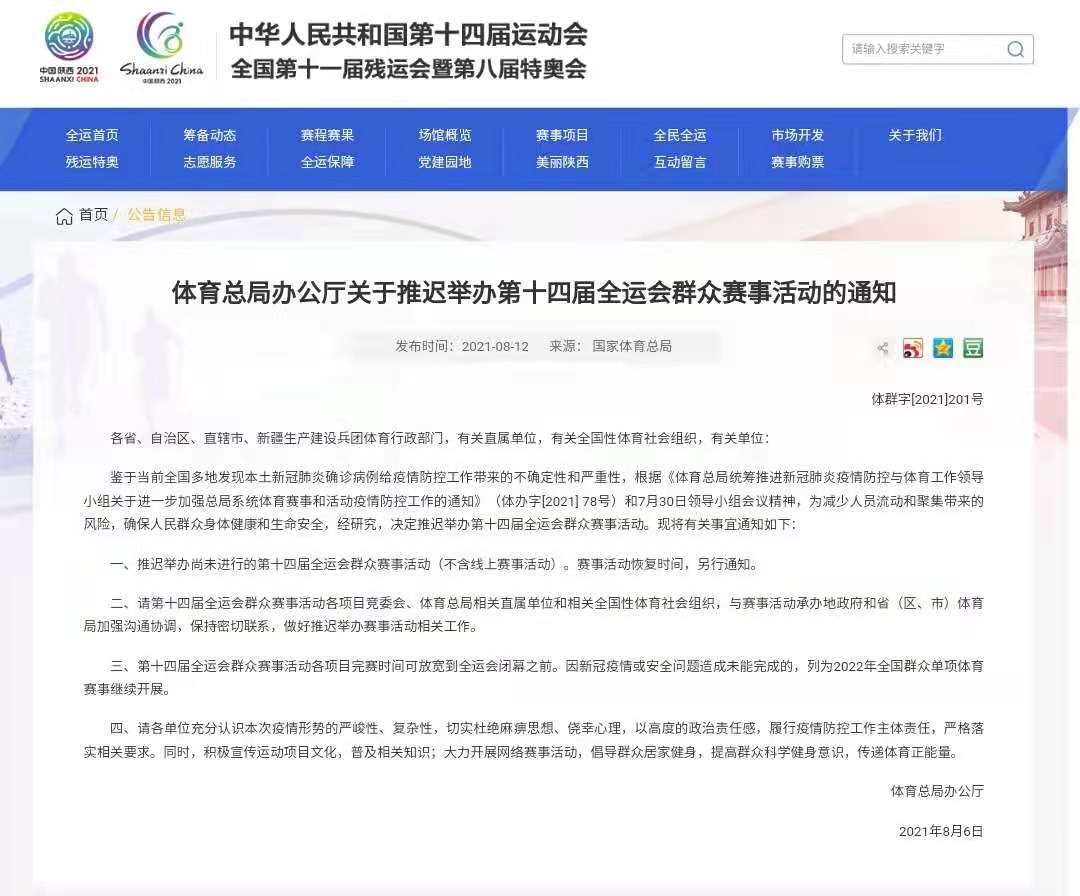 鉴于当前全国多地发现本土新冠肺炎确诊病例给疫情防控工作带来的不确定性和严重性,根据《体育总局统筹推进新冠肺炎疫情防控与体育工作领导小组关于进一步加强总局系统体育赛事和活动疫情防控工作的通知》和7月30日领导小组会议精神,为减少人员流动和聚集带来的风险,确保人民群众身体健康和生命安全,经研究,决定推迟举办第十四届全运会群众赛事活动。