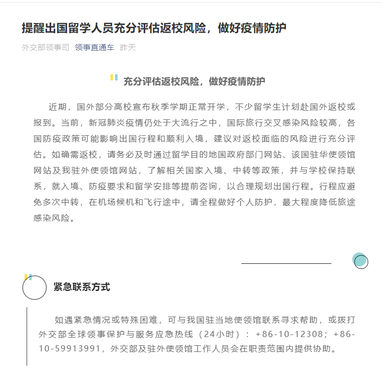近日,看度记者从外交部领事司获悉,因国外部分高校相继宣布秋季学期正常开学,不少留学生计划赴国外返校或报到。当前,新冠肺炎疫情仍处于大流行之中,国际旅行交叉感染风险较高,各国防疫政策可能影响出国行程和顺利入境,建议对返校面临的风险进行充分评估。如确需返校,请务必及时通过留学目的地国政府部门网站、该国驻华使领馆网站及我驻外使领馆网站,了解相关国家入境、中转等政策,并与学校保持联系,就入境、防疫要求和留学安排等提前咨询,以合理规划出国行程。行程应避免多次中转,在机场候机和飞行途中,请全程做好个人防护,最大程度降低旅途感染风险。