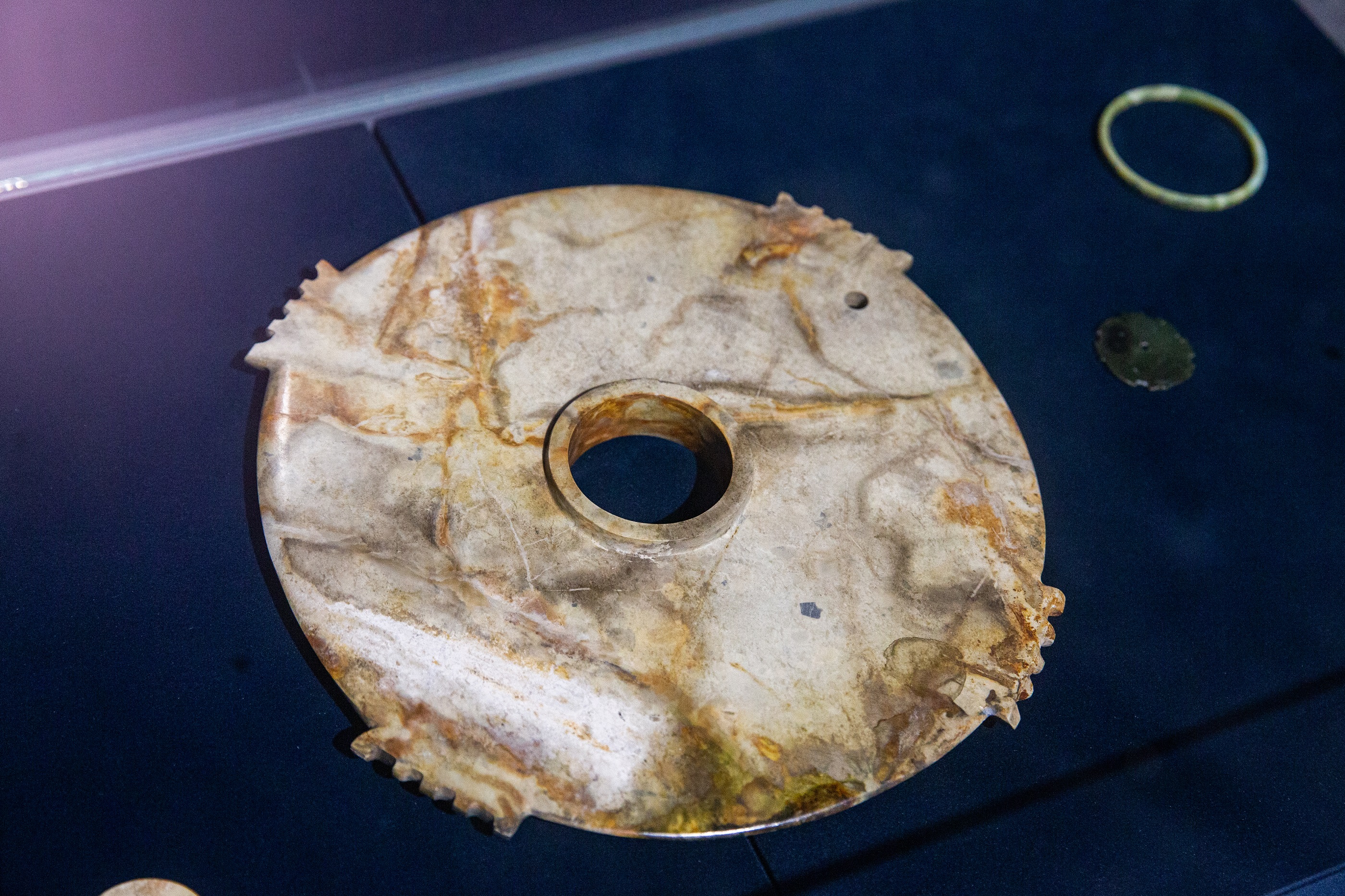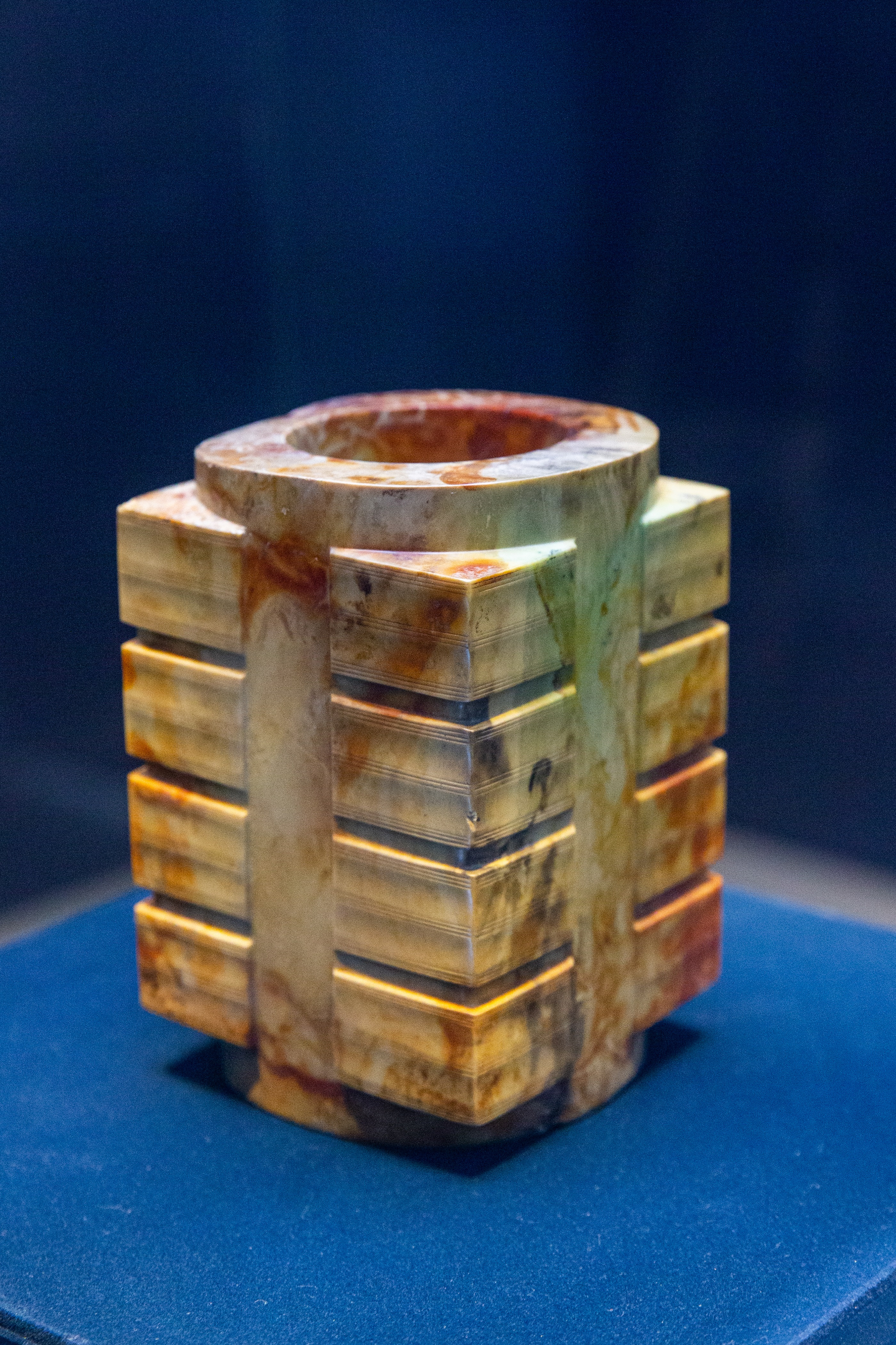 值得一提的是,作为中国同时期出土玉器最为集中的遗址,金沙本次精选30余件珍贵玉器出展。斑斓的色泽、似曾相识的造型,无不在诉说古蜀人琢磨之间流淌的文化交流密码。以四节玉琮为例,其分节分槽的造型是良渚文化特色,而色彩和玉质,则是典型的蜀地风格,可谓是长江流域文明交流的见证者。