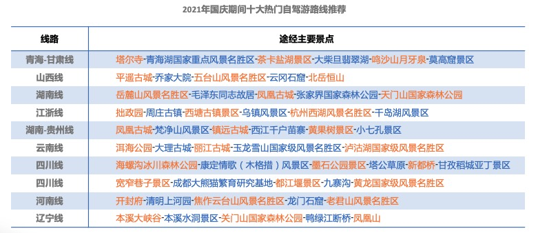 金秋十月,通过长途自驾体验大好河山成为很多有车一族的国庆出行选择。2021年国庆期间,预计全国自驾热门路线主要有青海-甘肃线、山西线、湖南线、江浙线等,其中青海-甘肃线(塔尔寺-青海湖国家重点风景名胜区-茶卡盐湖景区-大柴旦翡翠湖-鸣沙山月牙泉-莫高窟景区)热度最高。提醒自驾出游的公众注意交通安全,长时间驾驶后及时休息,切勿疲劳驾驶。