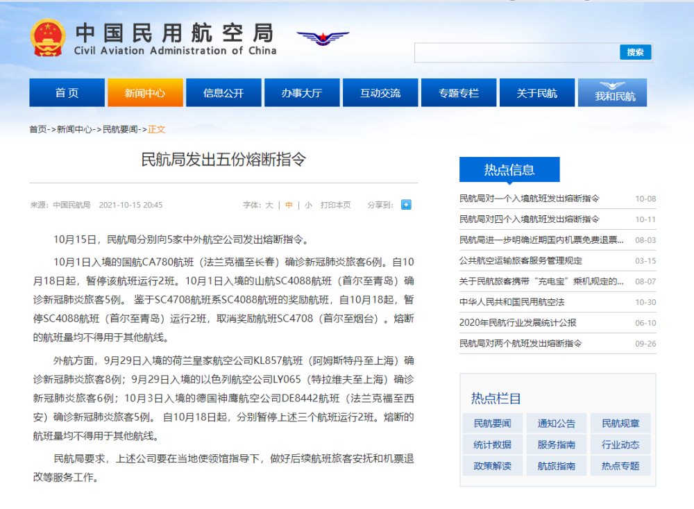 10月15日,民航局分别向5家中外航空公司发出熔断指令。