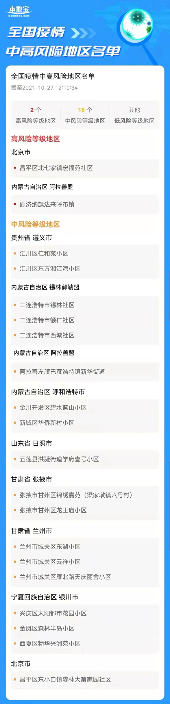 10月26日0—24时,31个省(自治区、直辖市)和新疆生产建设兵团报告新增本土确诊病例50例、本土无症状感染者4例。截至27日10时,此轮疫情已波及陕西、内蒙古、甘肃、宁夏、北京、贵州、湖南、湖北、河北、青海、四川和山东等多个省(自治区、直辖市),已有2个高风险地区和18个中风险地区。