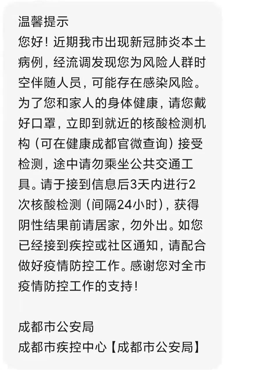 近期,新冠肺炎疫情出现反复,本土病例不断增加。11月4日,成都市公安局、市疾控中心发布提醒,与病例有轨迹重叠的人员会收到时空伴随风险人员短信提醒,或健康码由“绿”变“黄”,“时空伴随者”应立即向社区报备,并在3天内进行2次核酸检测,2次核酸检测间隔应在24小时以上,获得核酸阴性结果前请居家,不要外出。