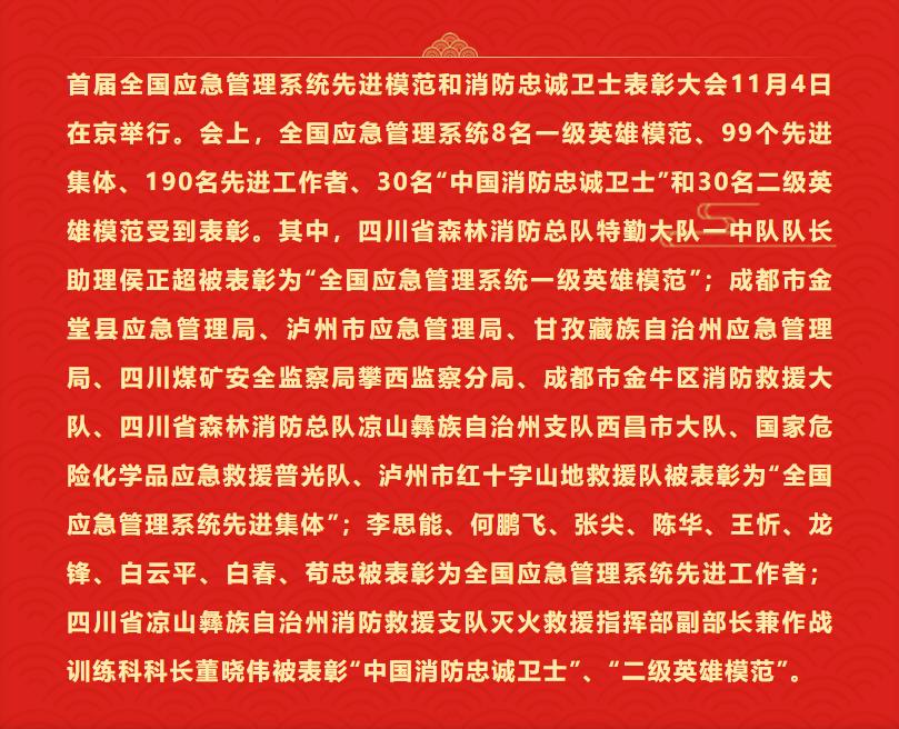 首届全国应急管理系统先进模范和消防忠诚卫士表彰大会11月4日在北京举行。四川11人8集体收到表彰: