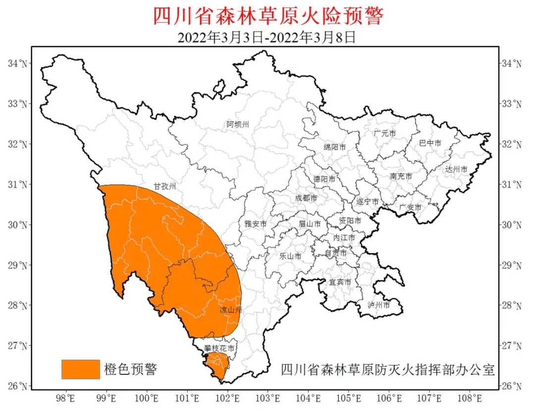 经四川省森防指办公室、省林草局、省气象局会商,综合研判气象条件、林区物候、野外火源及火灾发生情况,预计3月3日一8日,上述地区森林草原火险等级将维持在高度危险级别,防火形势十分严峻,特发布高森林草原火险橙色预警。
