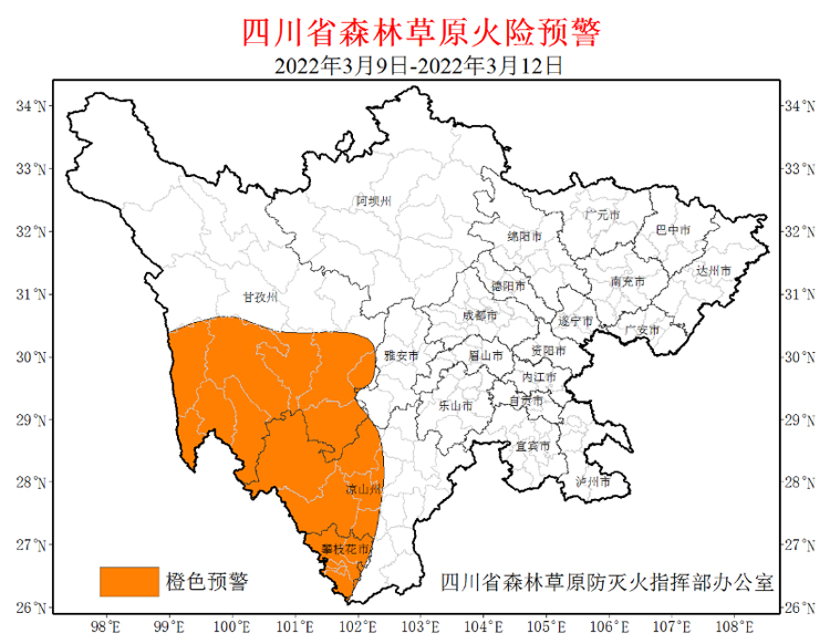 据气象部门预报,3月9日—12日攀枝花市大部、凉山州西部、甘孜州南部(具体范围见附图)主要林(牧)区以晴到多云天气为主,森林草原火险气象等级高。据林草部门预报,3月9日—12日上述地区森林草原火险等级可达4级。