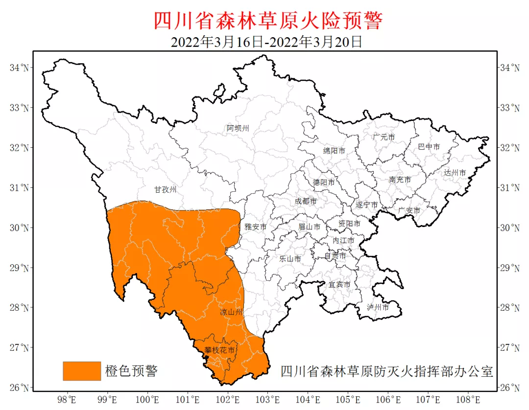 据气象部门预报,3月16日至20日攀枝花市大部、甘孜州南部、凉山州西部南部(具体范围见附图)主要林(牧)区以晴到多云天气为主,森林草原火险气象等级高。据林草部门预报,3月16日至20日上述地区森林草原火险等级为4级,局部可达5级。