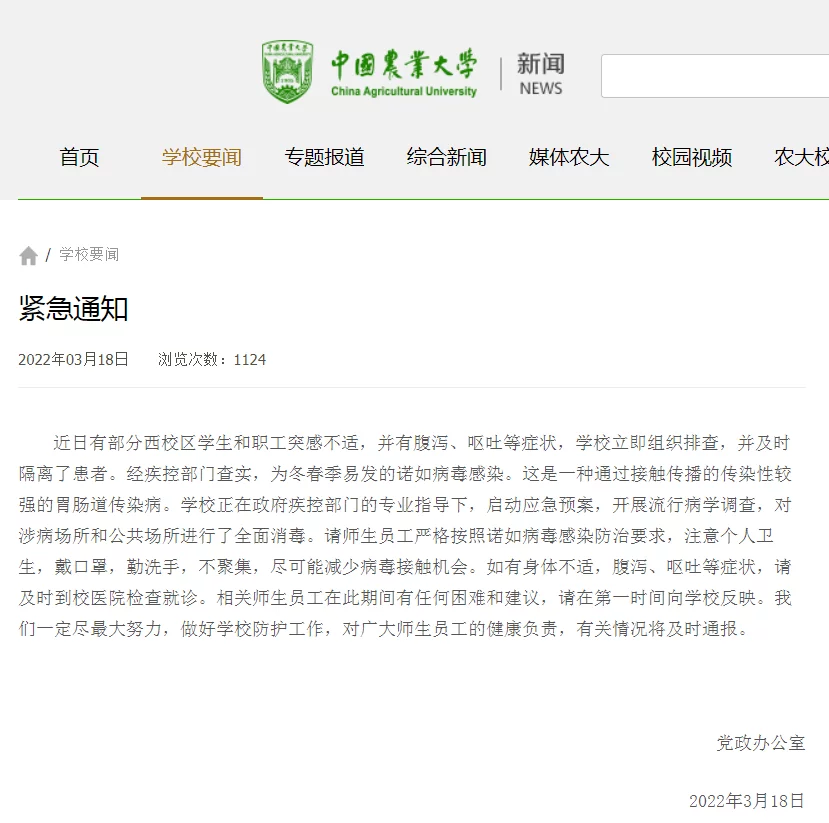 中国农业大学部分师生感染诺如病毒