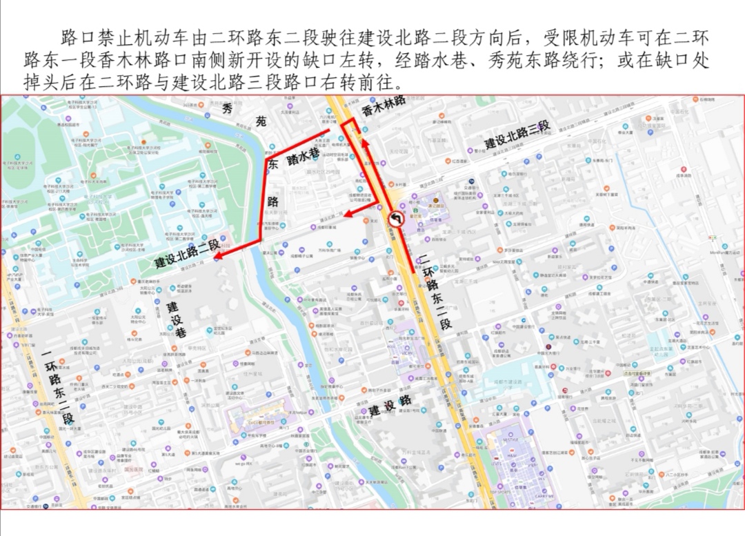 交通组织调整后,由建设北路二段左转驶往二环路东一段后受限机动车可经建设巷、建设路、二环路东一段绕行;由二环路东二段驶往建设北二段方向的受限机动车可在二环路东一段香木林路口南侧新开设的缺口左转,经踏水巷、秀苑东路绕行,或在缺口处调头,在二环路与建设北路三段路口右转绕行。