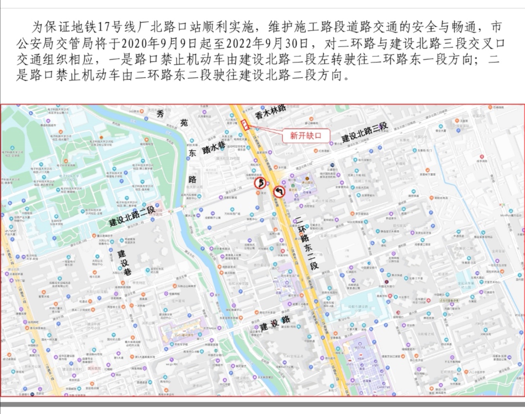 为保证成都市地铁17号线厂北路口顺利施工,从2020年9月9日起至2022年9月30日,对二环路与建设北路三段交叉口道路进行交通组织调整: