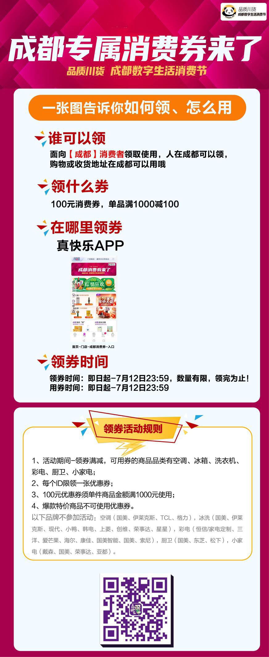即日起至7月12日23时59分,成都消费者凡注册登录真快乐APP,即可领取价值100元的优惠券,每人限领一张,数量有限,领完即止。单件商品金额满1000元即可使用,爆款特价商品不可使用优惠券。