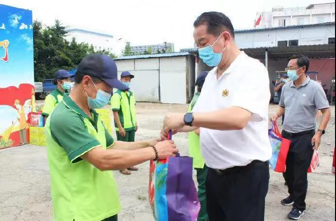 为关心关爱坚守在一线的环卫工人,切实做好防暑降温工作,郫都区综合行政执法局开展“送清凉”志愿服务活动,向坚守在城市一线冒着酷暑辛勤工作的环卫工人、市政工人、园林绿化工人等送去一份清凉,带去一份关爱。