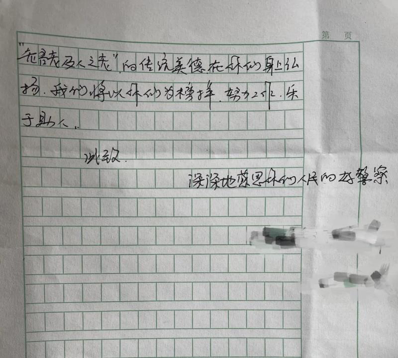 信中提到,“通过这件事,从你们身上我们感受到人性的温暖,体会到人民警察为人民的真正内涵。‘群众利益无小事’的理念在你们身上完美诠释,‘老吾老以及人之老’的传统美德在你们身上弘扬,我们将以你们为榜样,努力工作,乐于助人。”