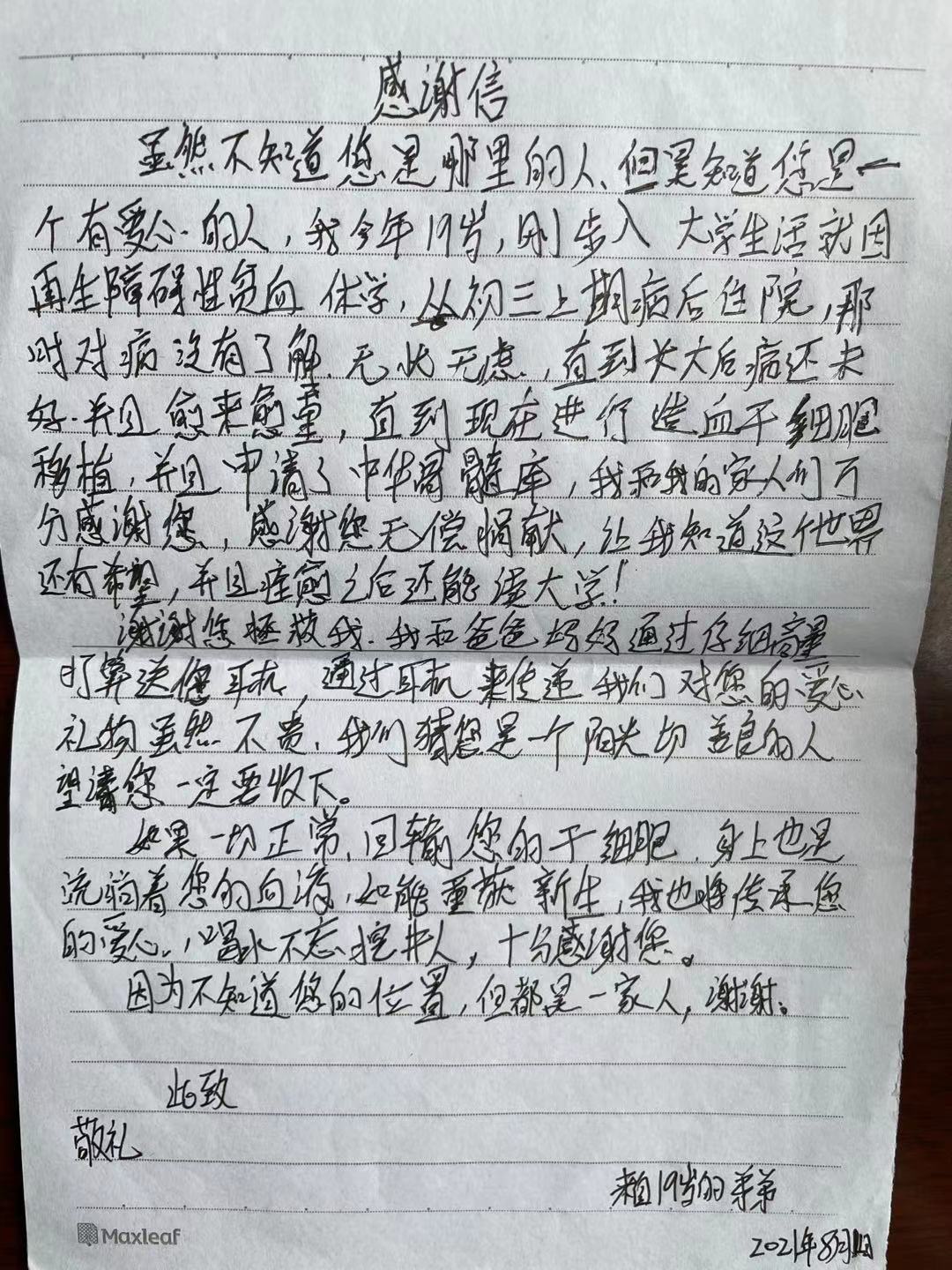 捐献完成后,四川省红十字会为刘林同志颁发了荣誉证书,递上了患者亲笔感谢信。“虽然不知道您是哪里的人,但是知道您是一个有爱心的人,我今年19岁,刚步入大学生活就因再生障碍性贫血休学。从初三上期病后住院,那时对病没有了解,无忧无虑,直到长大后病还未好,并且愈来愈重,直到现在进行造血干细胞移植,并且申请了中华骨髓库,我和我的家人们万分感谢您,感谢您无偿捐献,让我知道这个世界还有希望,并且痊愈之后还能读大学!”读着手里的信,刘林感慨万分,当时的一句愿意加入,竟然真的拯救了一位19岁年轻人的生命,重燃了一个家庭的希望。