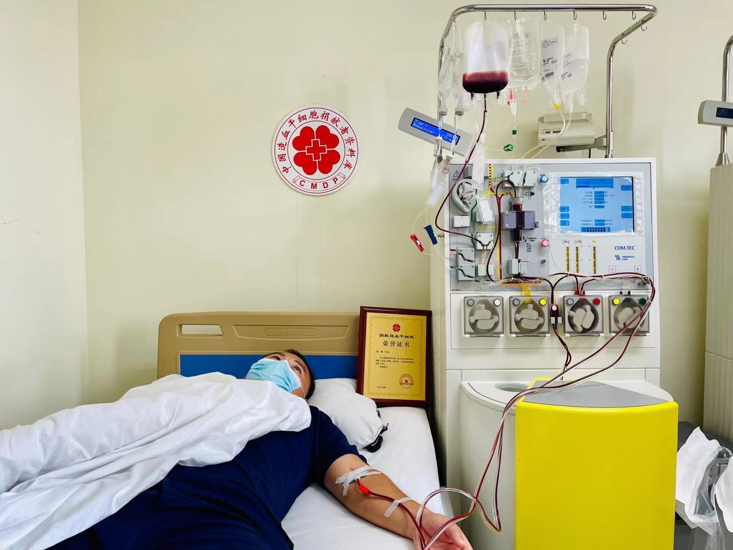8月10日上午9时,准备妥当的刘林按照计划开始捐献造血干细胞。黝黑的脸庞下,一双炯炯有神的眼睛带着好奇的神色观察着医院护士的整个操作流程,过程中还不忘提问,满足自己的好奇心,整个状态放松而自然。捐献过程中,因左臂血管破裂,血压不够无法正常输血,让不了解原因、一向对自己身体素质特别满意的刘林大感疑惑,了解原因后,他笑着说:“就是嘛,我这身体素质,不可能血压不够嘛!”输血管转移到右臂后,历经4个多小时,刘林同志成功捐献235毫升外周血造血干细胞,为素未蒙面的患者带去了生命的希望。