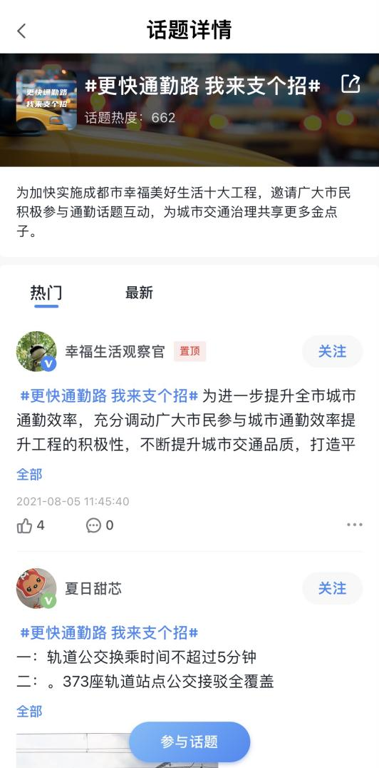 通过天府市民云App,在首页热门活动或进入“网络观察员”专区参与“成都市提升城市通勤效率金点子”话题活动。