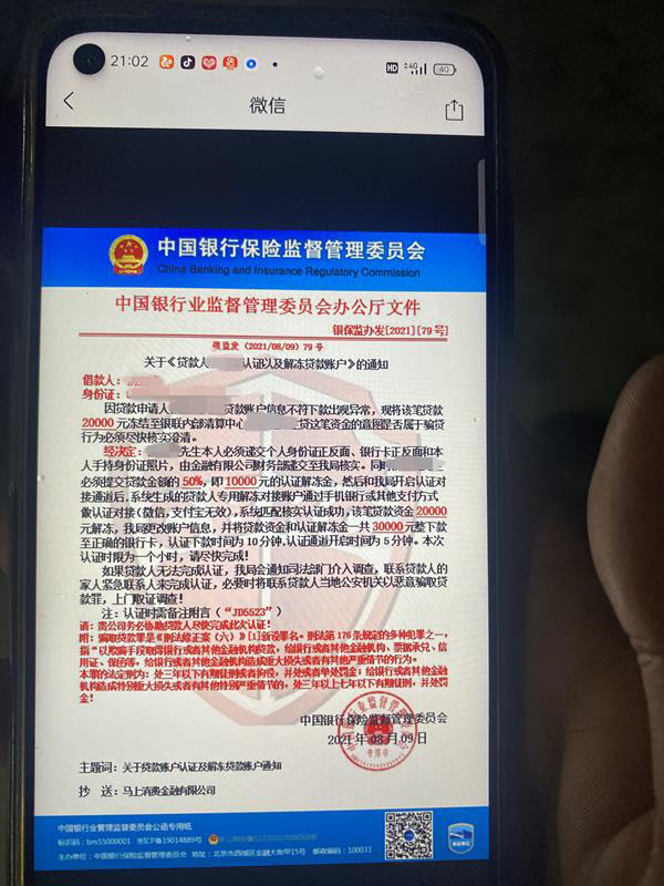然而在等待后台审核时,借款进度卡在了“身份证号错误”一项,系统提示如不及时处理,会影响个人征信并将冻结贷款账户。随后,“小吴”给杨先生发来了一份由“中国银行监督管理委员会办公厅”出具的红头文件,上面写道,因为杨先生的个人原因,现将冻结杨先生的贷款账户,如需解冻需要向指定账号交纳保证金10000元,解冻账号后才能发放贷款。