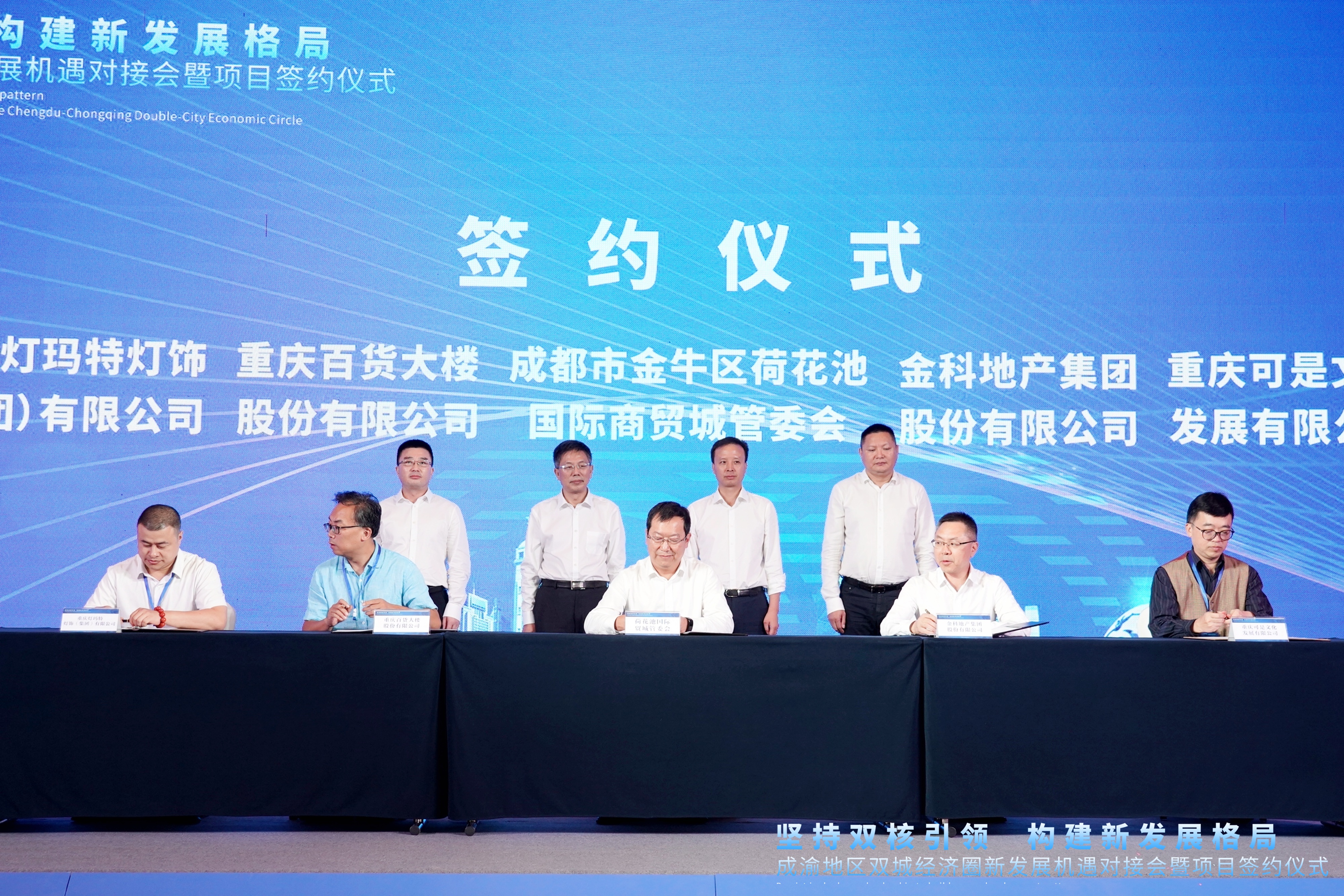 对接会现场,荷花池国际商贸城管委会与金科地产集团股份有限公司、重庆百货大楼股份有限公司、重庆可是文化发展有限公司、重庆灯玛特灯饰(集团)有限公司四家企业签订投资合作协议,投资金额达120亿元,未来将共同以双核引领构建新发展格局,打造成渝双城商业门户,全力提升“蓉北商圈”的规模能级和影响力。