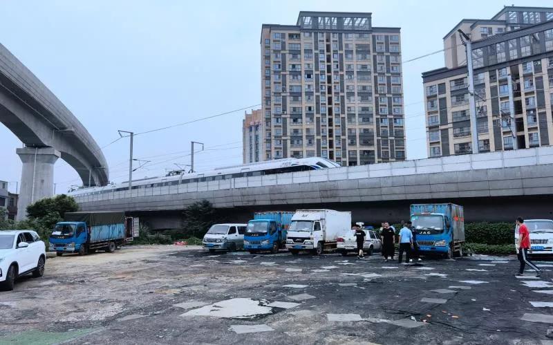 汽车穿过铁路桥洞直行约200米来到一简陋停车场,这个规模不大的停车场里停着数十辆小车、货车和环卫车。停车场左侧距高铁铁路线仅20米的地方停放着一辆白色厢式货车,其前方正好停有两台白色的小车,一名上身穿着黑色短袖的男子正忙着给车辆加油,旁边另一名男子正在提油桶往另一台车上装。不一会儿提油桶的男子上前让记者搭乘的车让一下,加好油的车辆要离开。