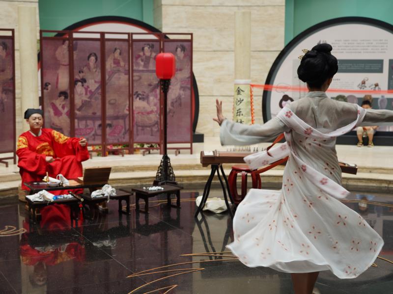 同样围绕临展“回望长安——陕西唐代文物精华展”设计的体验项目,还有在中秋节当日推出的首档博物馆实景沉浸式剧本游——《金沙之夜·回望长安》。据介绍,该剧发生在开元年间。长安城中有金沙乐坊、陆善镖局、丝绸乐坊、金沙商会四大阵营,他们为获得玄宗赏赐的黄金和题字牌匾,展开激烈的比拼。玩家们随机加入四大阵营,需根据发布的任务与NPC演员互动,在展厅中仔细观察文物展品,阅读展板文字从而寻找答案,帮助各自的阵营获得胜利。