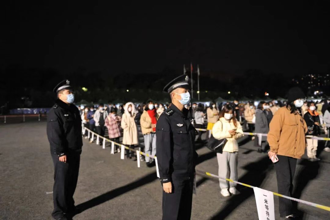 各个点位等待检测的群众排队如长龙,绵延百米却井然有序,白衣天使们连续工作5、6小时不停歇,忙忙碌碌却态度和蔼,志愿者们、锦警蜀黍维持着现场的秩序,帮助需要的群众,坚守到凌晨两点……