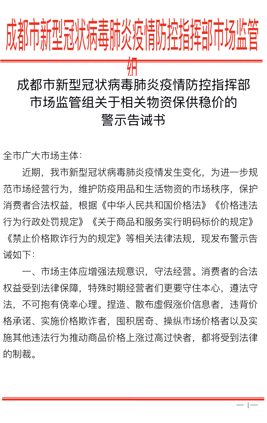 成都市新型冠状病毒肺炎疫情防控指挥部市场监管组关于相关物资保供稳价的警示告诫书