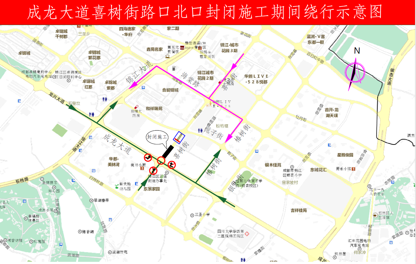 施工期间,原经上述受限路口由东向北右转的车辆和行人,可提前经椿树街、海棠路等道路绕行;原经上述受限路口由西向北左转的车辆和行人,可提前经锦江大道、海棠路等道路绕行;原经上述受限路口由南向北直行的车辆和行人,可右转经椿树街、海棠路等道路绕行。