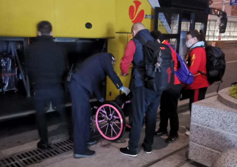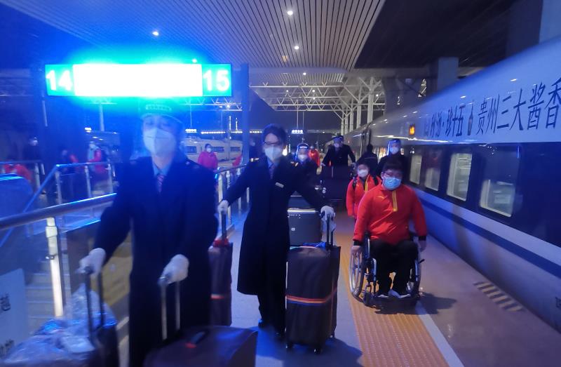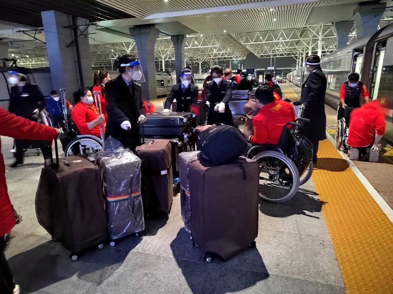 “得知消息后,我们结合当前疫情防控形势和残疾人团队的实际需求,制定了专门的出站流线。”该站游佳服务岗负责人说道,车站为27名残疾人运动员开辟绿色通道,协调交警部门,引导接站的大巴停靠在方便残疾人出站的南落客平台,并安排13人全程引导、搬运行李、推送轮椅,为他们提供了帮扶服务。从列车抵达至运动员团队乘大巴离开成都东站,整个过程仅耗时不到10分钟。
