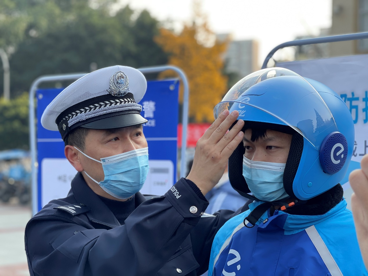 12月2日上午,在金牛区金科苑社区广场,成都交警联合金牛区公安分局与属地街办、交通运输部门、社区群众和外卖小哥共同参与“122全国交通安全日”主题宣传活动。在活动现场成都交警通过展示交通安全宣传展板、发放交通安全宣传单、播放交通安全宣传片、现场讲述典型交通事故案例等方式向社区群众宣讲骑乘电动两轮车佩戴头盔的重要性。