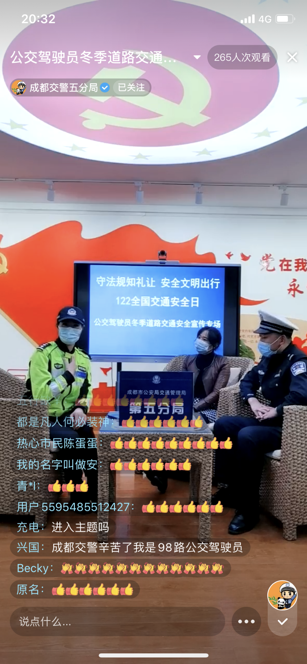 为了更好的向广大群众宣传交通安全理念,成都交警还通过新媒体平台现场直播的方式,结合122宣传主题,有针对性地向公交驾驶员开展冬季道路交通安全宣传,在讲解交通的同时,实时为网友答疑解惑、以案说法,吸引了大批网友参与互动。