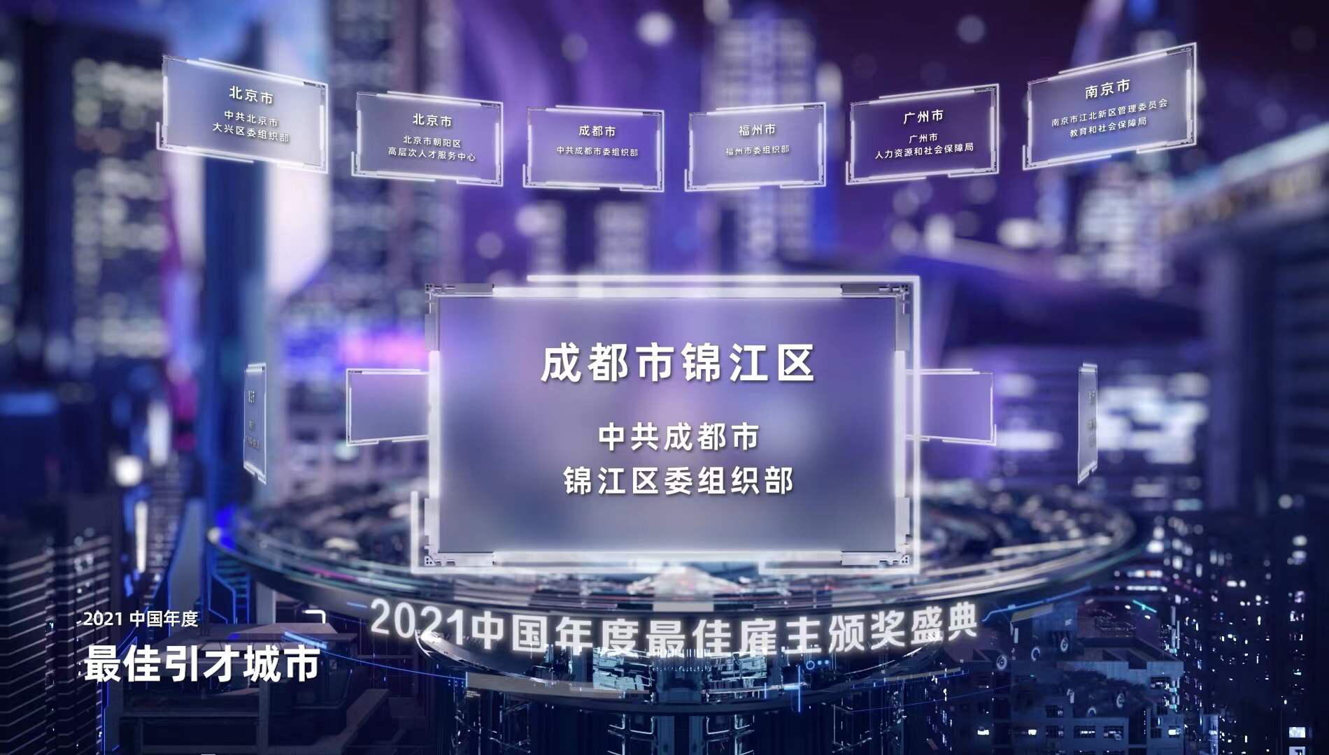 近日,2021中国年度最佳雇主直播颁奖典礼在线上举行,活动揭晓了“2021中国年度最佳引才城市”榜单,成都市蝉联“中国最佳引才城市”奖,锦江区作为西部唯一区县蝉联“中国最佳引才城市(区县级)”奖。