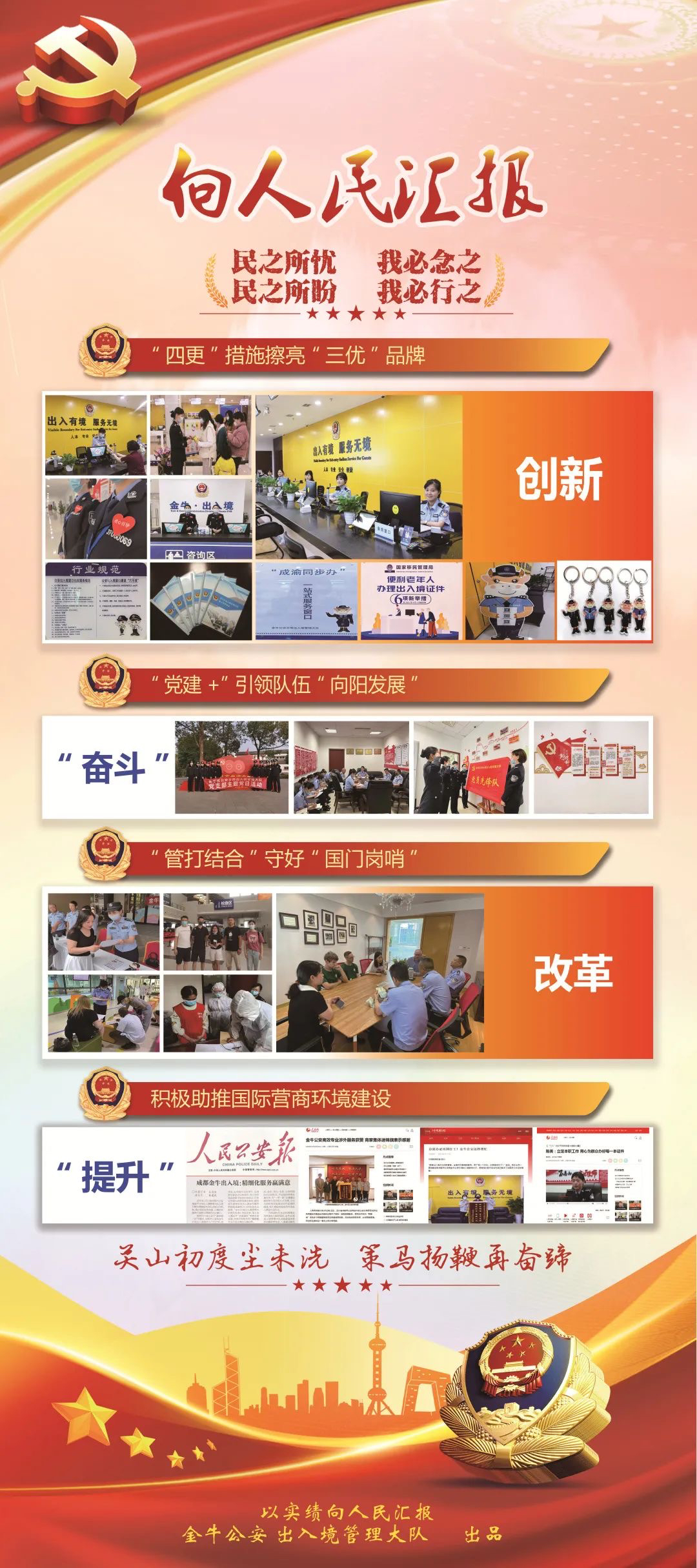 一张“向人民汇报”的海报,是成都金牛公安出入境管理大队全体民辅警用少年无华的奉献、英勇顽强的斗志践行着曾经的誓言。先后被授予“成都市巾帼文明岗”“四川省巾帼文明岗”、全省“三星窗口”等荣誉称号,同时出入境管理大队作为全区唯一,全市仅五家单位,被成都市妇联推荐2022年全省“三八红旗先进单位”。
