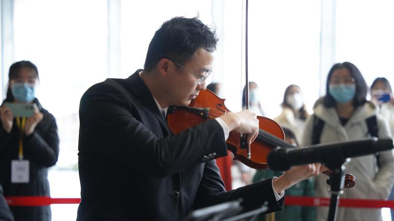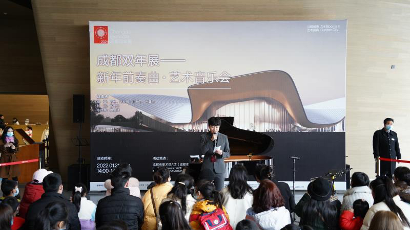 2022年1月21日下午,“成都双年展——新年前奏曲·艺术音乐会”在成都市美术馆A馆(成都市天府美术馆)内举办。本次活动邀请四川音乐学院的演奏者们,在“超融体:2021成都双年展”的现场,将音乐与美术进行融汇,以艺术特有的方式,为观众呈现一场别样的审美经历,一同迎接即将到来的春节。