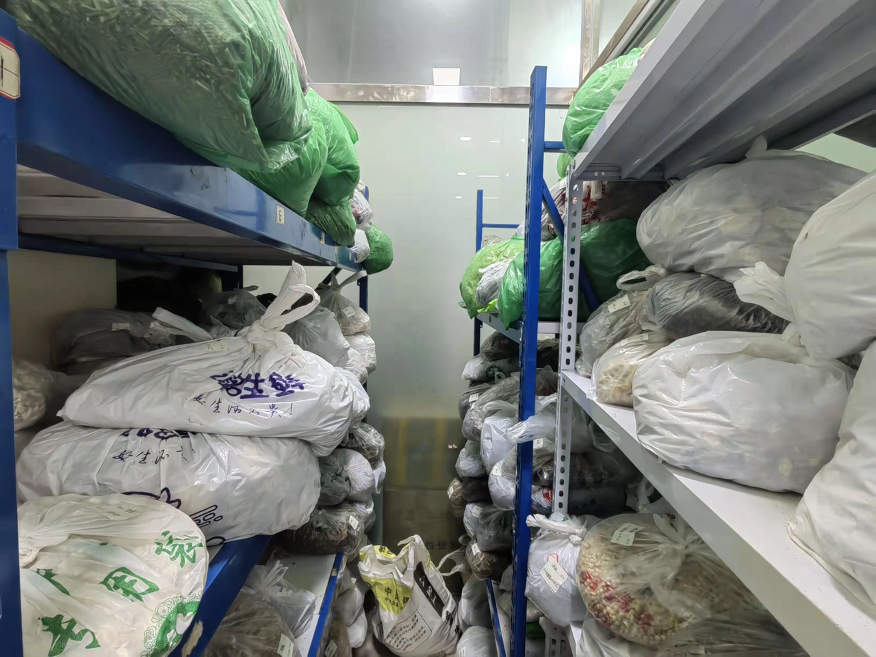随后,执法检查人员扩大检查范围,来到诊所仓库。该仓库位于诊所一角,是一个临时玻璃房,里面两排货架上堆满了各种中药饮片,除极少部分有生产厂家的预包装外,其余均是由各式的塑料袋、编制袋或纸箱装着。
