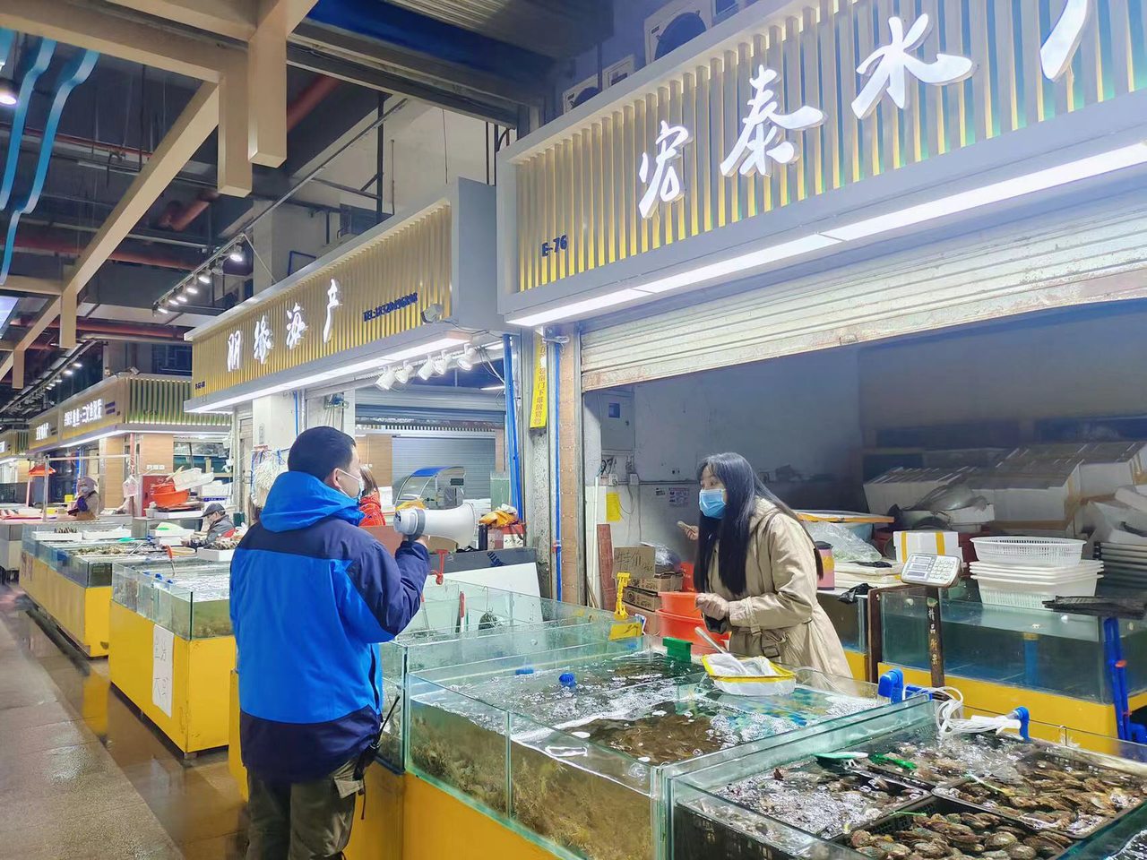 这一周的成都,气温骤降,室外温度只有仅仅5-6摄氏度。但为做好市场防疫工作,工作人员丝毫不放松,每天一边巡查场内交易情况,一边提醒过往客户及商户做好防疫措施。