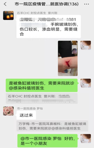 “家中小朋友在玩耍时不慎被鱼缸玻璃划伤腕部,需要就医。”2月27日,成都高新区人居天府世家石羊社区卫生服务中心驻点保障医生曾兴刚接到居民求助电话。在初步摸清情况后,立即对接市一医院万学梅医生,安排双方通过视频沟通,经线上问诊,划伤儿童需送至定点医院进行伤口清创缝合。